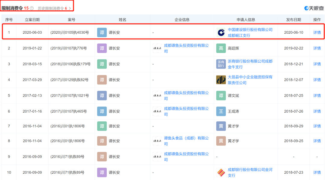谭长安也多次被限制消费。最近的一次是2020年6月,由中国建设银行股份有限公司成都岷江支行申请。谭长安欠建行成都银行不到5万的金额。截至2018年3月27日,谭长安尚欠建行成都岷江支行借款本金44921.69元、利息2954.52元、罚息1126.94元。