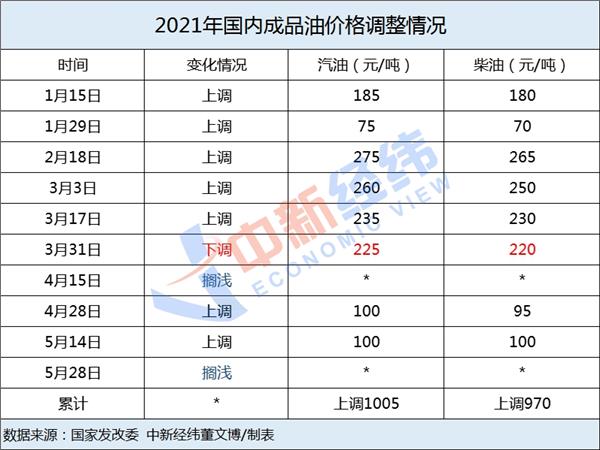 据中新经纬客户端梳理,今年以来,国内成品油调价目前已进行了十轮,具体为上调七次、下调一次、搁浅两次,汽油价格累计上调1005元/吨,柴油价格累计上调970元/吨。