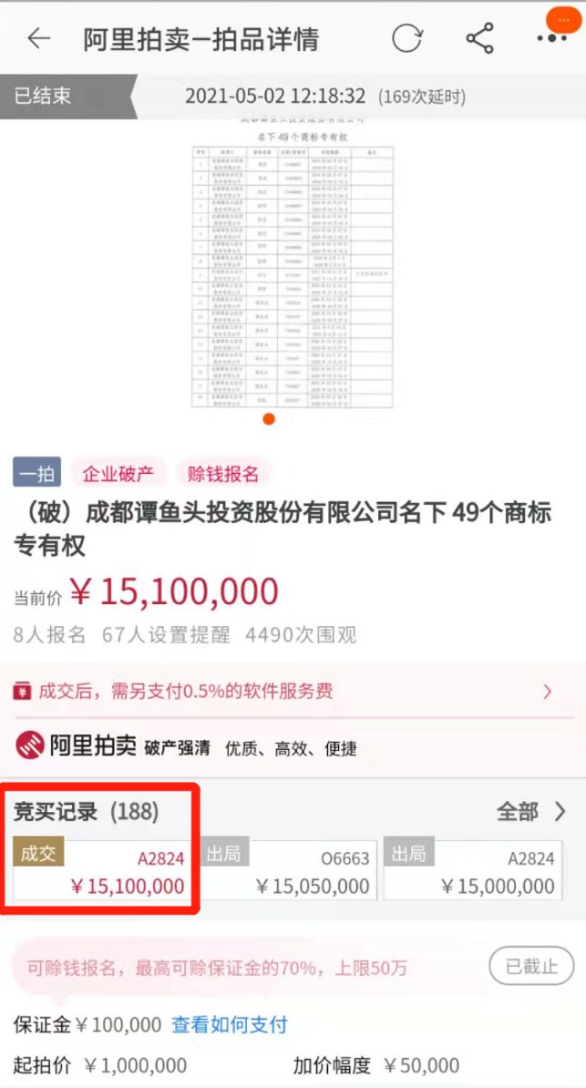 2021年5月1日10时至5月2日10时,成都谭鱼头投资股份有限公司(成都谭鱼头)管理人在淘宝网阿里拍卖强清平台,对成都谭鱼头名下的49个商标专有权进行拍卖,起拍价为100万元。